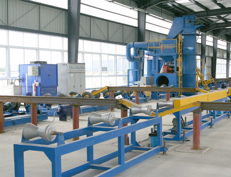 該系列鋼管拋丸清理機是輥道送料的大、中、小型管徑鋼管及圓柱體拋丸清理設備,主要是利用高效拋丸器拋出的高速彈丸流束,打擊鋼管表面上的氧化皮、銹層及其雜物,使之獲得精細光亮表面,提高工件表面的抗拉和抗壓強度,并具有一定表面粗糙度,為其表面涂漆保護增加附著力,有利于提高鋼管涂飾質量,達到防腐、護管、延長鋼管使用壽命之目的。