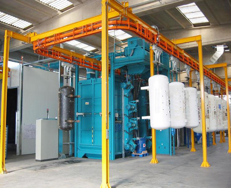 該系列懸掛式拋丸清理機是利用高效強力拋丸器拋出的高速丸流,拋打位于室體內對著拋射位置定點旋轉的工件表面與內腔,去掉其上的粘砂、氧化銹層及其他雜物,使之獲得一定精細的光亮表面,從而提高了工件的表飾質量。本機廣泛應用于鋼鐵、冶金、機車車輛、工程機械、重礦機械等行業。